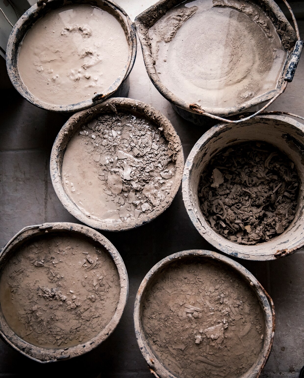 Marjoke leidt ons de wenteltrap af naar haar atelier. De benedenverdieping is net Willy Wonka's chocoladefabriek, maar dan met een krijtachtig wit interieur. Er staan machines waarmee ze de klei kneedt en vormt, zoals elektrische draaischijven en de plakkenpletter – het woord van het jaar. Op tafels liggen hompen ('broden', om in vaktermen te blijven) klei klaar voor gebruik, op de vloer staan afgedichte emmers met verschillende glazuren en in bomvolle stellingkasten staat vers geglazuurd keramiek te wachten op de laatste stookronde. Blikvangers zijn ook de gereedschapjes in allerlei vormen en maten, al dan niet zelfgemaakt.