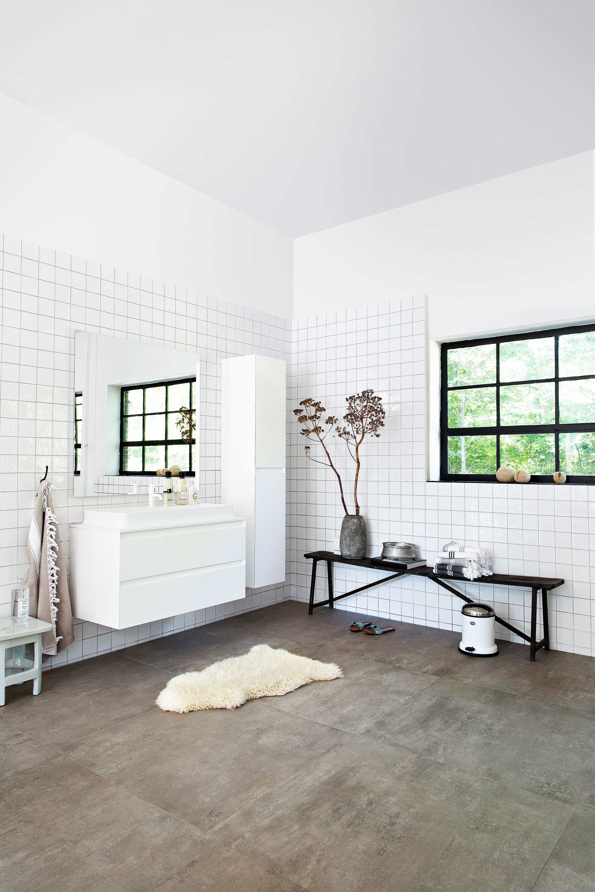 Tegels Square in kleur Powder White, 10×10 cm, wastafel Shell in kleur Powder White met 1 kraangat 100x50x10 cm (bxdxh),onderkast Shell in kleur Powder White met 2 lades 100x50x40 cm (bxhxd), kast Shell in kleur Powder White met 2 deuren, 170x35x35 cm (hxbxd), spiegel Groove zonder verlichting 100×100 cm. De badkamermeubels zijn binnenkort verkrijgbaar.
