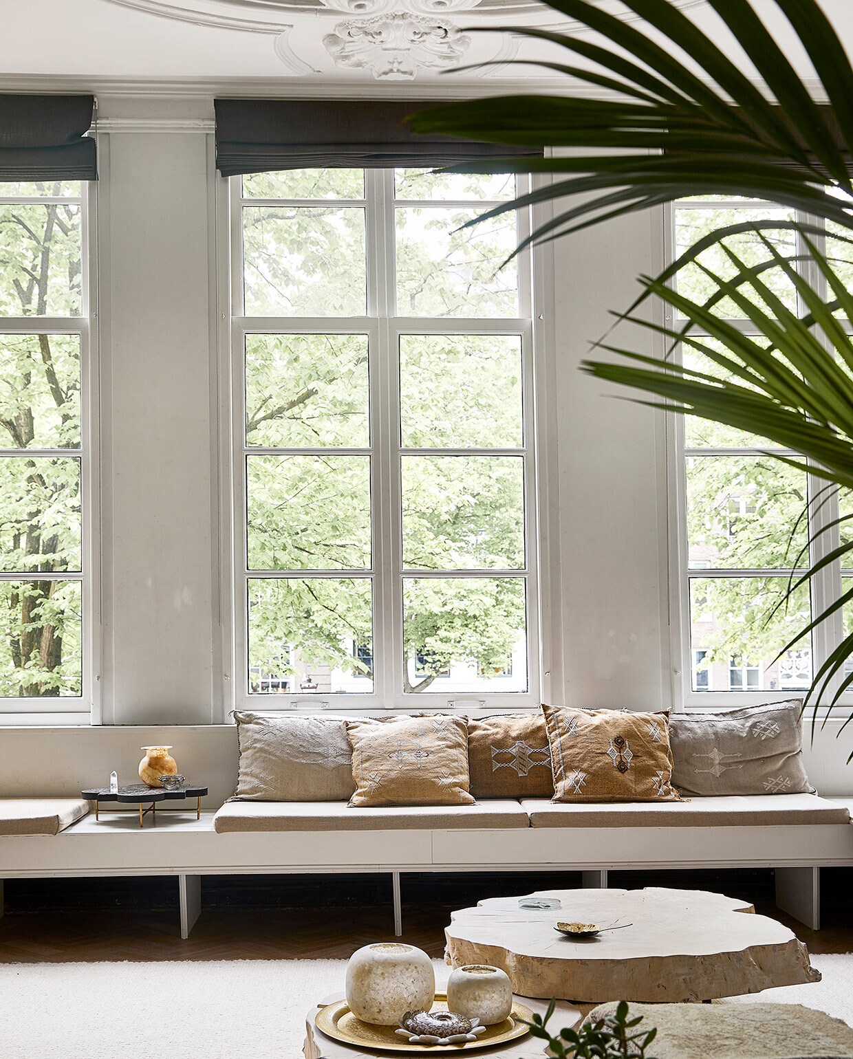 Komen vrienden binnenwaaien, dan lopen ze negen van de tien keer in één streep naar de bank in de vensterbank. 'Daar zit je zo lekker in de zon,' vertelt Karin, 'en zie je, als je over je schouder kijkt, de bootjes in de gracht. Sinds kort vaart er zelfs een buurvrouw met een gondel.' Het sluit aan bij waarom zij en haar man vielen voor de woning. Hartje stad, maar toch rustig. Karakteristieke details als 'knalhoge ramen'. En veel zon- en daglicht. 'Het kan ons, en zeker Hussein, niet zonnig genoeg zijn. Dit huis past als een jas.'