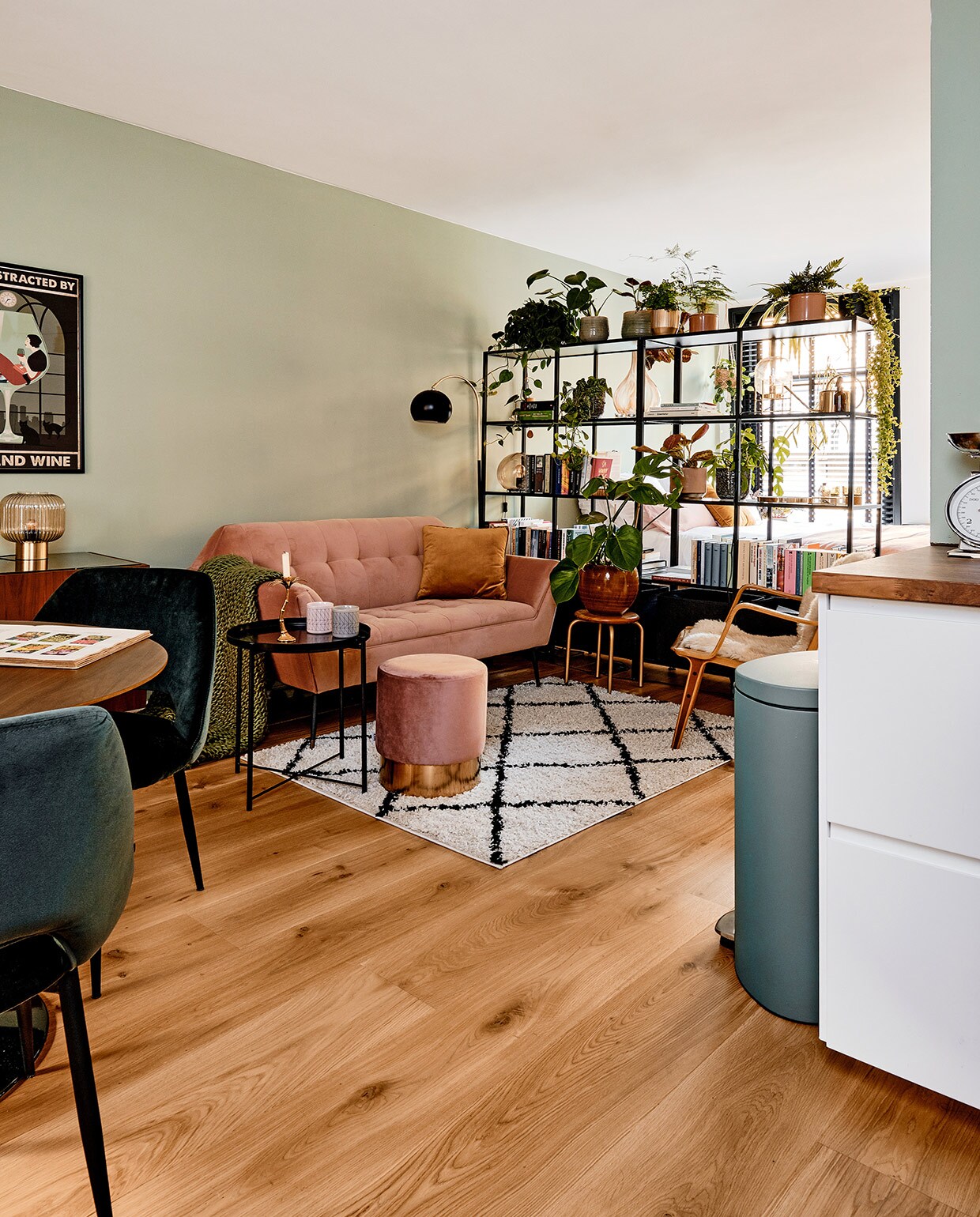 'Al snel stond vast dat het uitgangspunt van de slimme studio groen en roze werd, met als extra kleuren okergeel, walnoot en zwart. Aan de hand daarvan ben ik op zoek gegaan naar meubels en accessoires, waarbij mijn voorkeur voor velvet en een vintagelook leidend was.' Andere keuzes zijn, door de beperkte vierkante meters, meer praktisch ingestoken. Zo schaft ze voor extra opbergruimte een bed aan met kasten eronder. 'Hoewel ik diep in mijn hart best groter zou willen wonen, verbaas ik mij erover hoeveel spullen ik hier kwijt kan. Zo ligt mijn hele administratie onder het bed.'