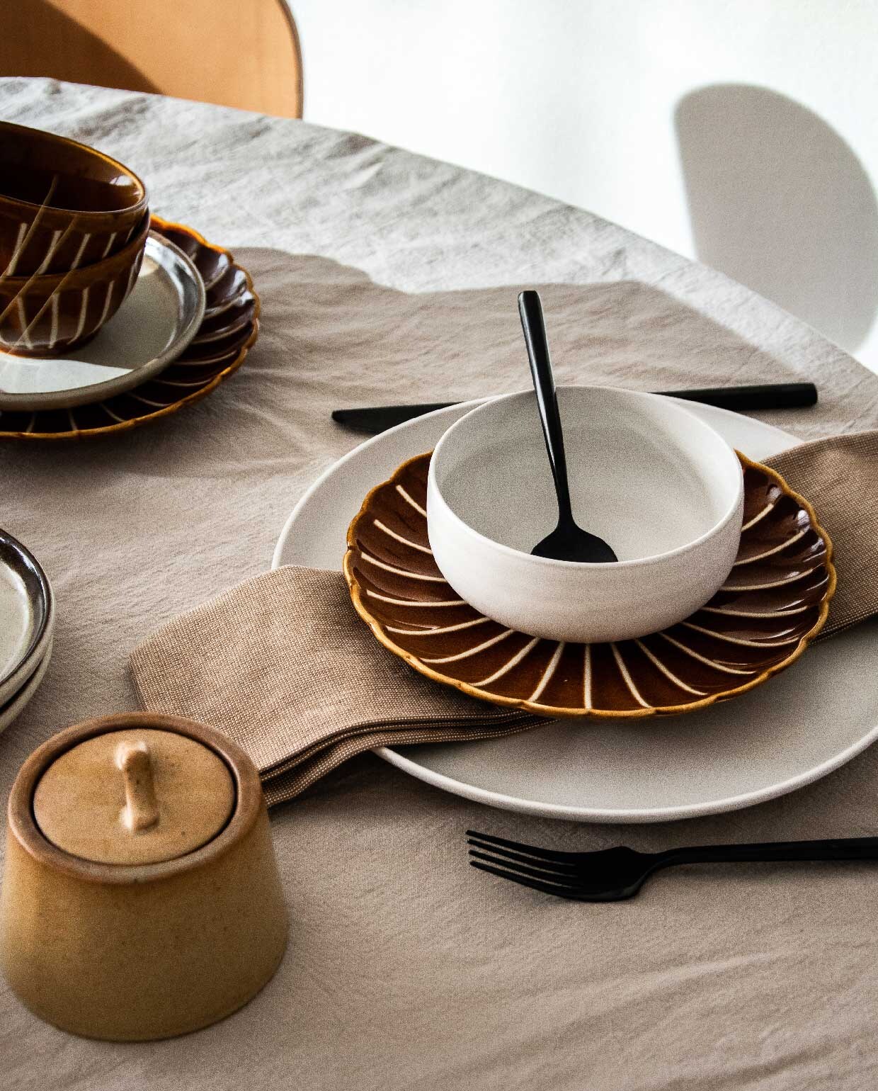 Handgemaakt of niet, bij mij thuis is overal keramiek te vinden. Borden, kopjes, kannen, kandelaars en vazen… Wat mij betreft kun je er niet genoeg van hebben! Tafeldekken is daarom ook een bezigheid die ik helemaal niet erg vind. Niet alleen tijdens speciale gelegenheden of feestdagen, maar ook gewoon bij het dagelijkse diner. Dan haal ik al mijn verschillende serviezen uit de kast en etaleer ik ze mooi op tafel. Bruine kommen, handgemaakte mokken en een bijpassende kandelaar. Ik ben niet het type dat een bij elkaar passend 10-delig servies heeft. Ik houd er juist van om te combineren! Als basis servies heb ik een aantal eenvoudige witte borden. Daarnaast heb ik allerlei verschillende aardewerk producten met kleuren en patronen om het gezellig te maken. Zo kan ik blijven afwisselen en ziet de tafel er elke keer weer bijzonder uit!