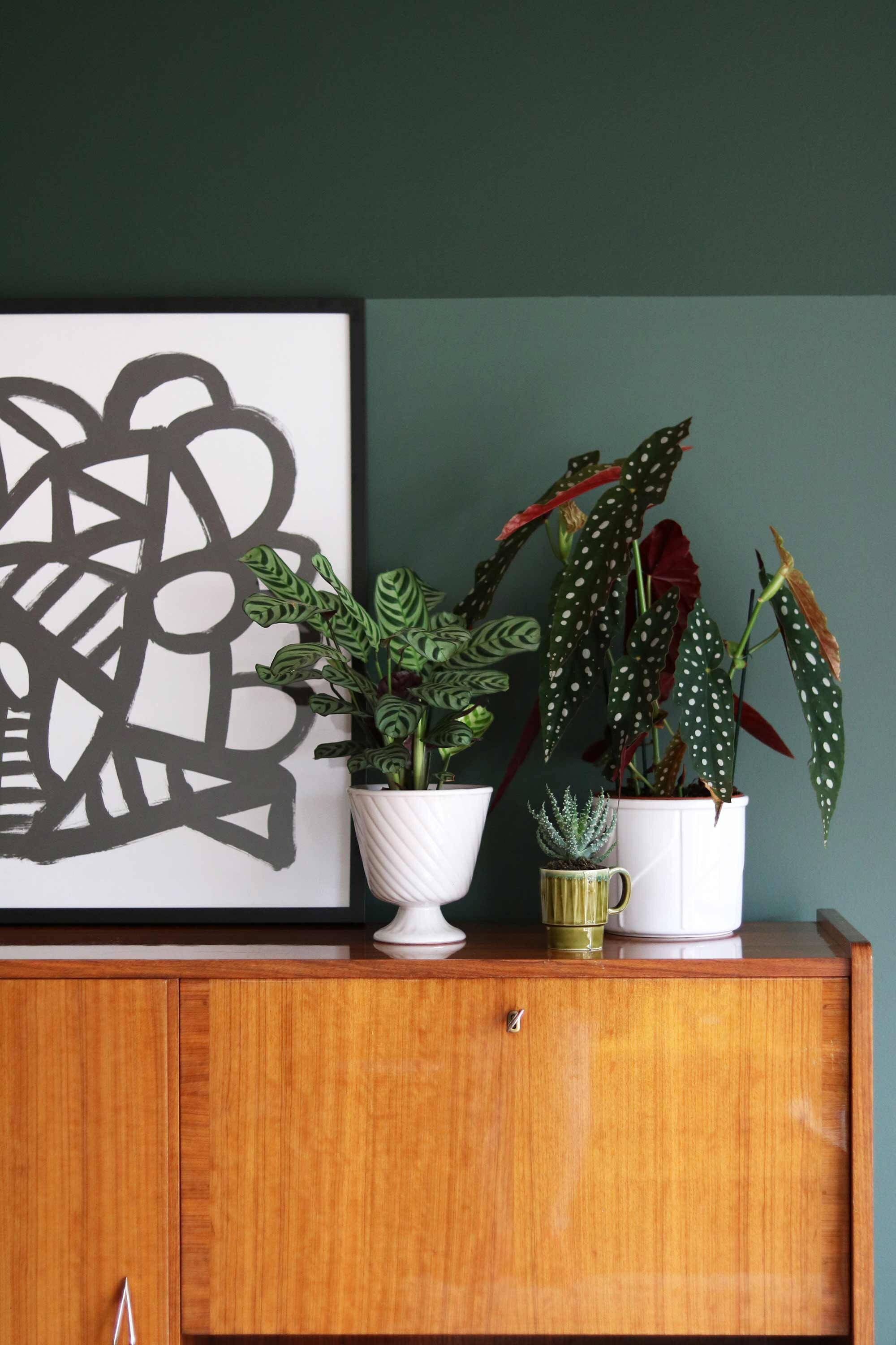 De andere plant die je ziet op de foto's is de 'Begonia Maculata', ook wel bekend als de 'Polkadot Begonia' vanwege zijn stippenpatroon op de bladeren. Deze kamerplant past dus ook perfect bij deze trend. Ik vind hem prachtig met het speelse stippenpatroon en rode kleur aan de onderkant van de bladeren! Allesbehalve doorsnee planten op deze kast dus…