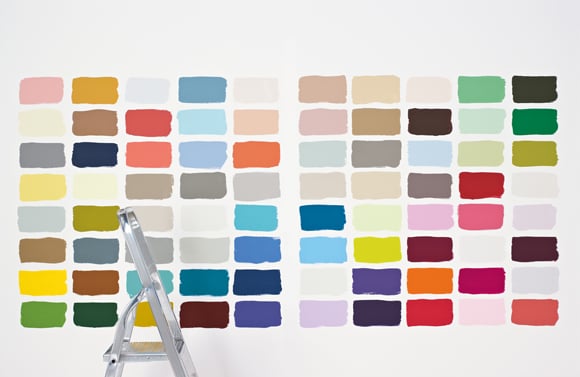 Een palet bestaat natuurlijk uit kleuren die op elkaar zijn afgestemd. Als je een kamer wilt schilderen en je hebt kleuren die onveranderlijk zijn, zoals de vloerbedekking en de gordijnen, dan maken ze toch deel uit van het kleurpalet. Hou ze daarom altijd in gedachten als je de overige kleuren uitzoekt. Als regel begin je met de materialen met de minste keus en werk je toe naar de materialen met de meeste keus. Dus bijvoorbeeld: eerst kijken naar de bestaande vloerbedekking, dan de gordijnen uitzoeken en als laatste pas de kleur van de muur.