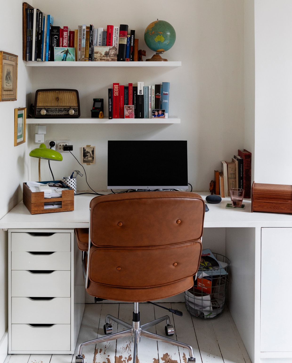 Een andere tip is om de stoel mooi te integreren in de werkkamer door materialen en kleuren op elkaar af te stemmen of juist te laten clashen. Een houten Thonet-stoel contrasteert bijvoorbeeld prachtig met een stalen bureau. En het koele aluminium frame van een Vitra-stoel staat mooi naast een warm, houten bureau.