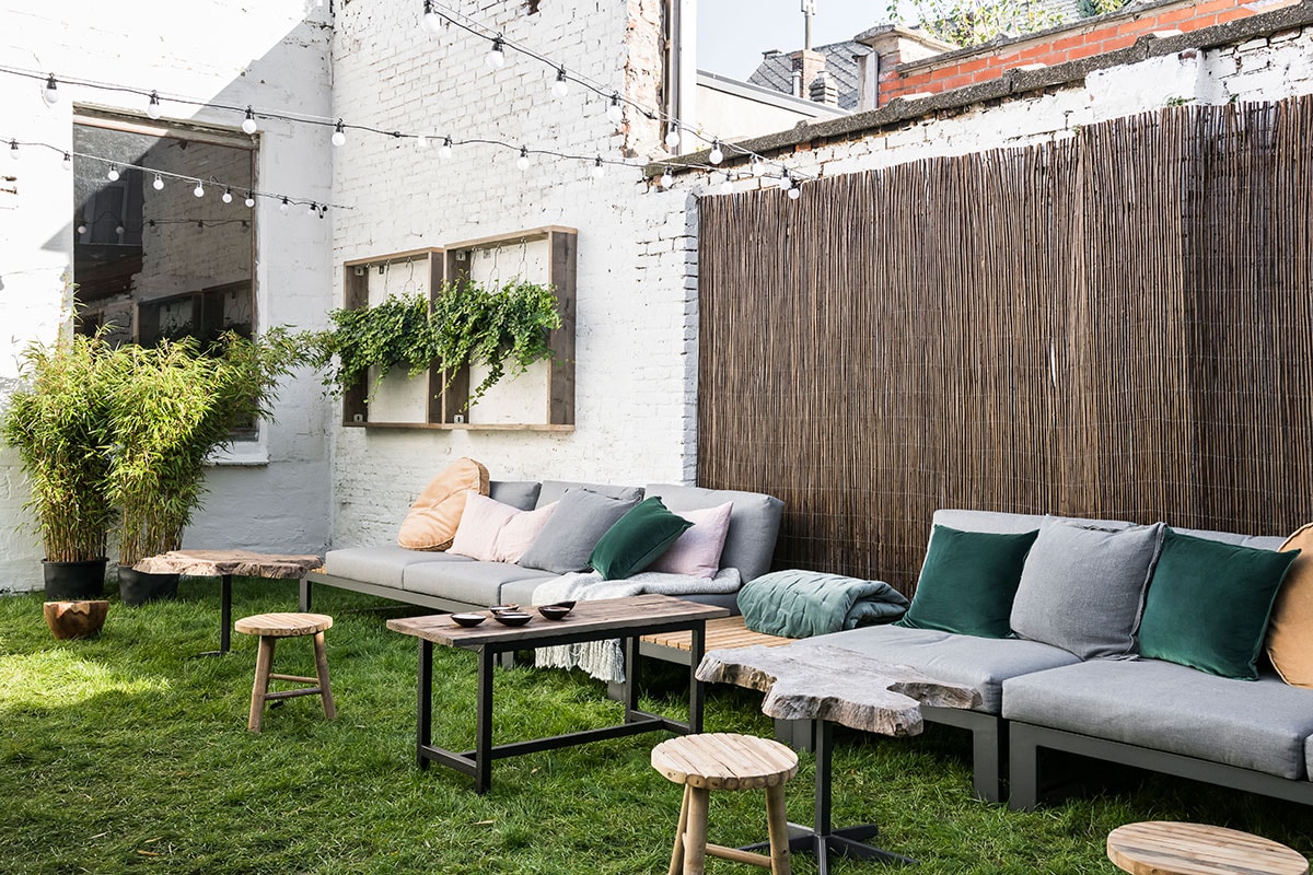 Plaid – fluweel groen: vtwonen collectie bij Meubelen VerberckmoesHouten tuinbank: Nordal bij vtwonen.be