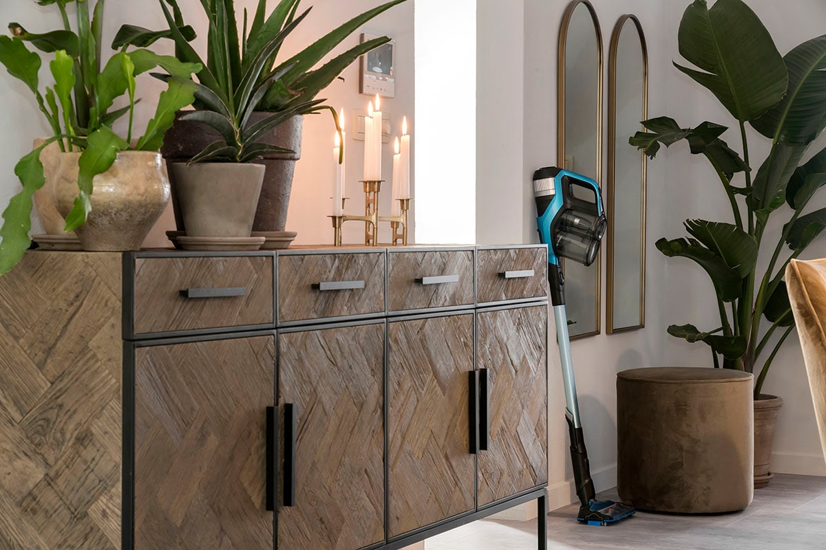 Een goed begin is het halve werk. Investeer dus in kwalitatief sterke huishoudtoestellen. Wie met een stofallergie kampt, zal niet willen wachten tot de wekelijkse poetsbeurt om stof aan te pakken. Moussa en Naima kregen van de stylisten een snoerloze steelstofzuiger, de Philips SpeedPro Max Aqua. Zo'n gestroomlijnd model berg je makkelijk op, waardoor je 'm ook twee keer zo snel uit de kast zult nemen dan een stofzuiger met snoer. Maar de echte troeven voor Naima zitten 'm in de extra functies: een dweilfunctie, ledverlichting en extra zuigkracht.