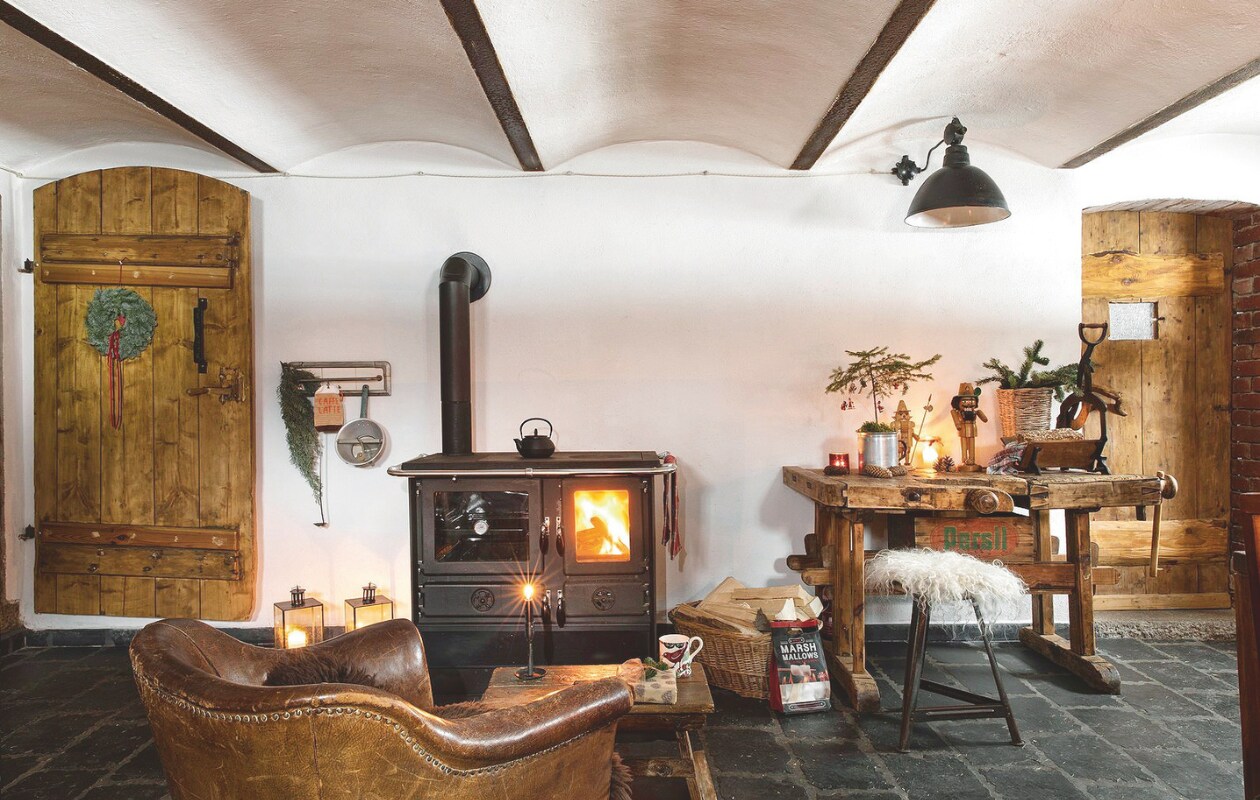 In de zitkamer, waar de originele planken van de muren en het plafond bewaard bleven, staat een sfeervolle gietijzeren kachel. In de winter komt daar steevast een kerstboom bij, die door Daryja wordt versierd. 'Ik houd ervan om alles mooi aan te kleden voor de gasten. Ik hang lichtjes buiten en zet versieringen, zoals een kaarsenboog en notenkrakers, neer.' De moeite die Oliver en Daryja doen om hun vakantiewoning zo stijlvol in te richten, maakt deel uit van hun filosofie. 'Vakantiehuizen worden vaak geassocieerd met het cliché van eenvoud en ouderwetse inrichting. Wij willen het rustieke leven in het bos en op het platteland liever wat geraffineerder maken.'