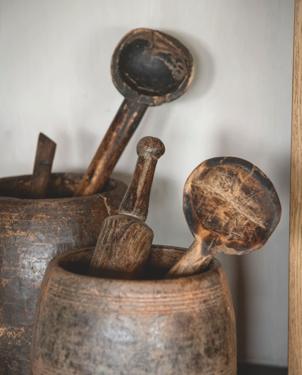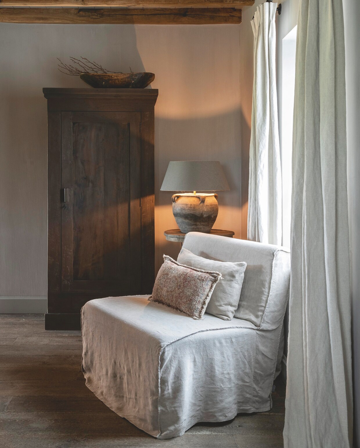 'Ik ben altijd weg geweest van de landelijke stijl die we hier hebben gecreëerd. Het brengt een warm gevoel en een soort rust in huis.' De liefde voor die stijl is overal terug te zien in het interieur, van antieke houten snijplanken die ze in Nederland kocht tot de grote ramen waar veel licht binnenkomt. 'Als we naar buiten kijken, zien we elk seizoen veranderen', legt Martine uit. 'De velden zijn constant in beweging, wat ons het gevoel geeft dat we in een natuurlijk schilderij leven.'