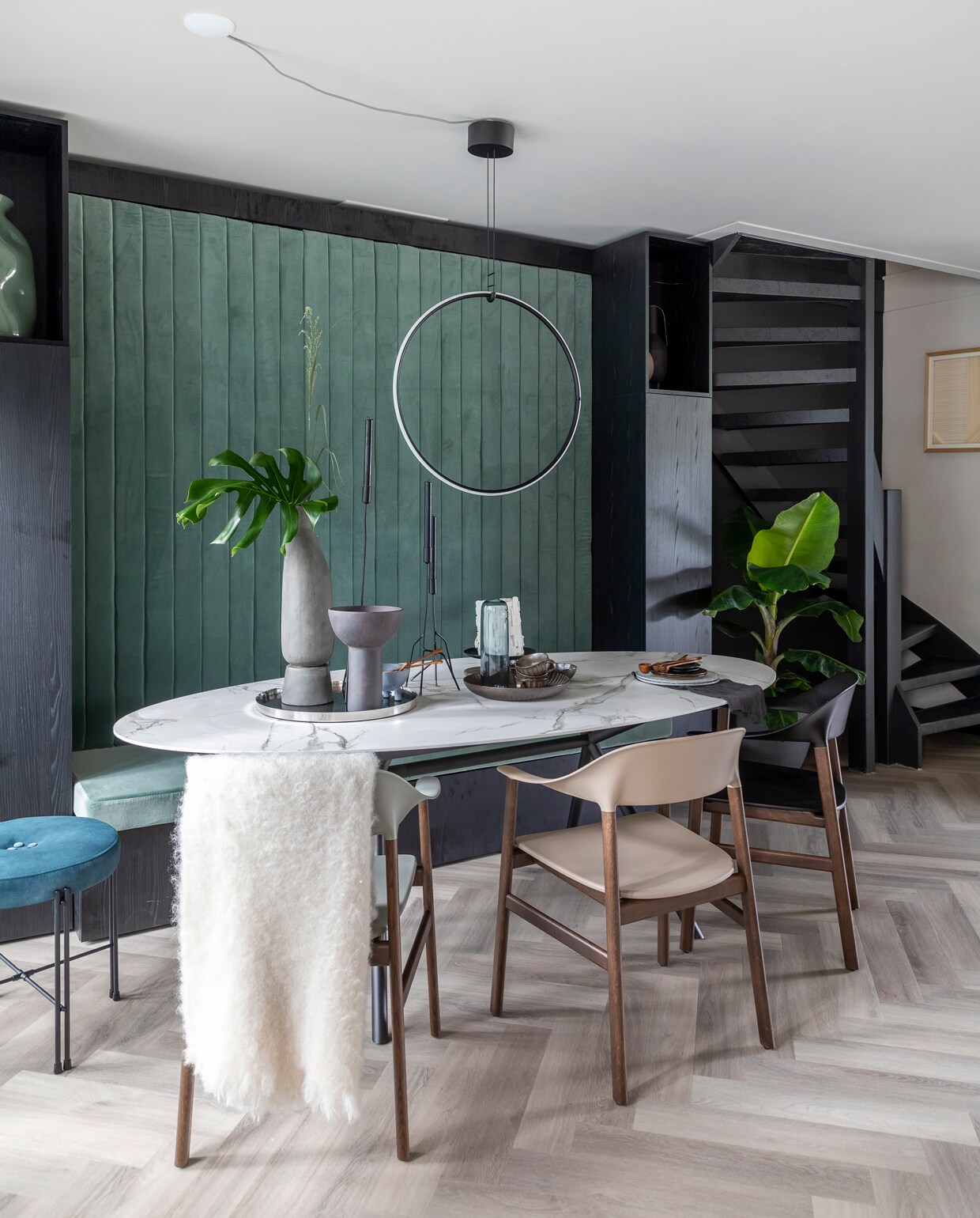 Ook in een industrieel en robuust interieur kun je fluweel goed verwerken. Een voorbeeld daarvan is de fluwelen wand bij Laura en Gert-Jan uit Winkel. Stylist Liza koos voor een strakke eethoek, omdat Gert-Jan van die stijl houdt. Ze combineerde het met een groene fluwelen stof om Laura tegemoet te komen. Gaat een fluwelen wand jou te ver? Combineer een strakke tafel dan bijvoorbeeld met fluwelen stoelen.