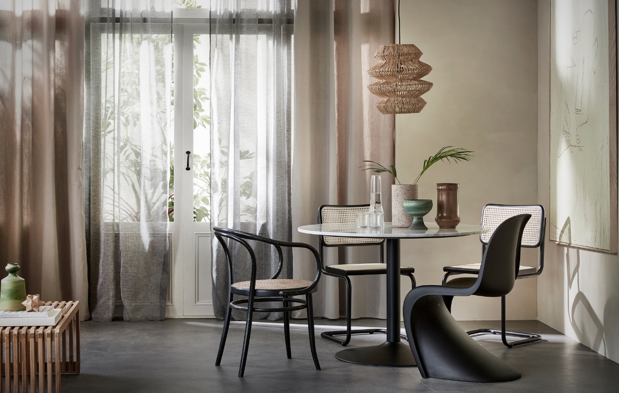 Kies in een kleine woonkamer voor meubels in efficiënte vormen, zoals een kleine ronde eettafel. Deze neemt minder ruimte in beslag dan een vierkante of rechthoekige eettafel. En zeg nou eerlijk: een ronde tafel is toch één en al gezelligheid?