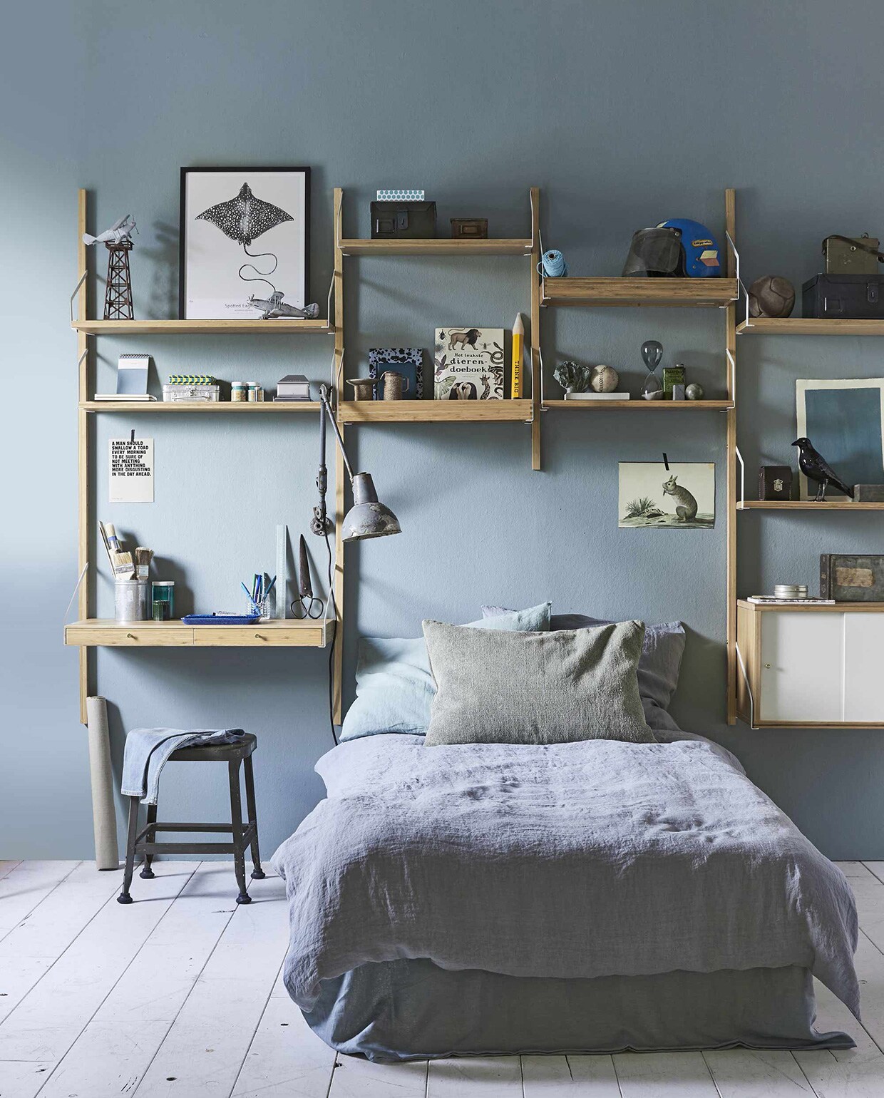 Optische trucs zijn in een kleine kamer de redder in nood. Hang bijvoorbeeld een hele wand vol met spiegels – vindt de ijdele puber vást niet erg – om het licht van buiten naar binnen te halen. Maak hier een leuk project met je puber van: ga een middag naar de lokale kringloopwinkel, scoor een doos vol spiegels in allerlei maten en geef de lijsten allemaal dezelfde kleur (of ga voor ton sur ton). En voilà, je hebt een unieke spiegelwand én optisch meer ruimte gecreëerd.